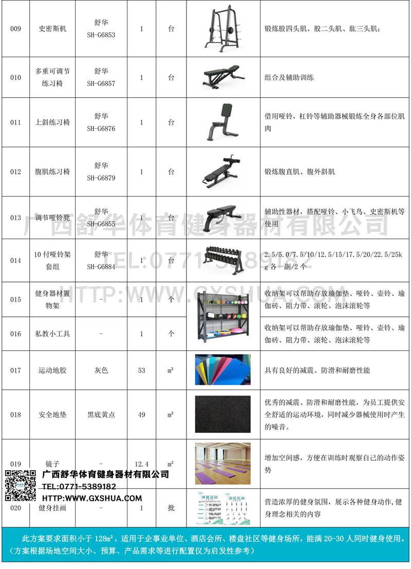 此方案要求面积小于135m²,适用于企事业单位、酒店会所、楼盘社区、学校等健身场所,能满20-30人同时健身使用。(方案根据场地空间大小、预算、产品需求等进行配置仅为启发性参考)